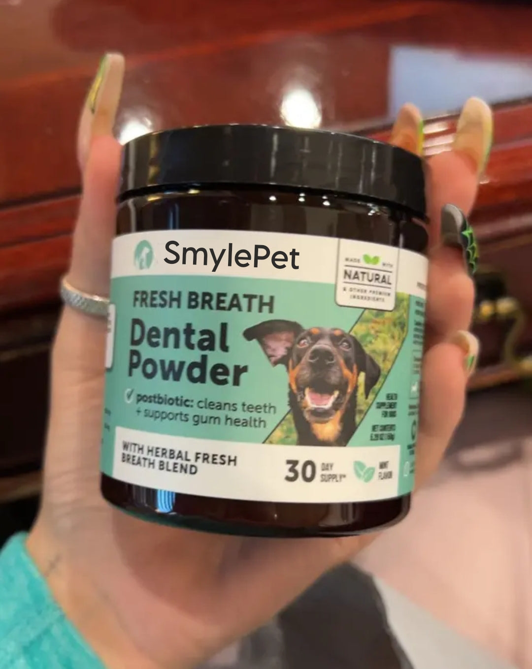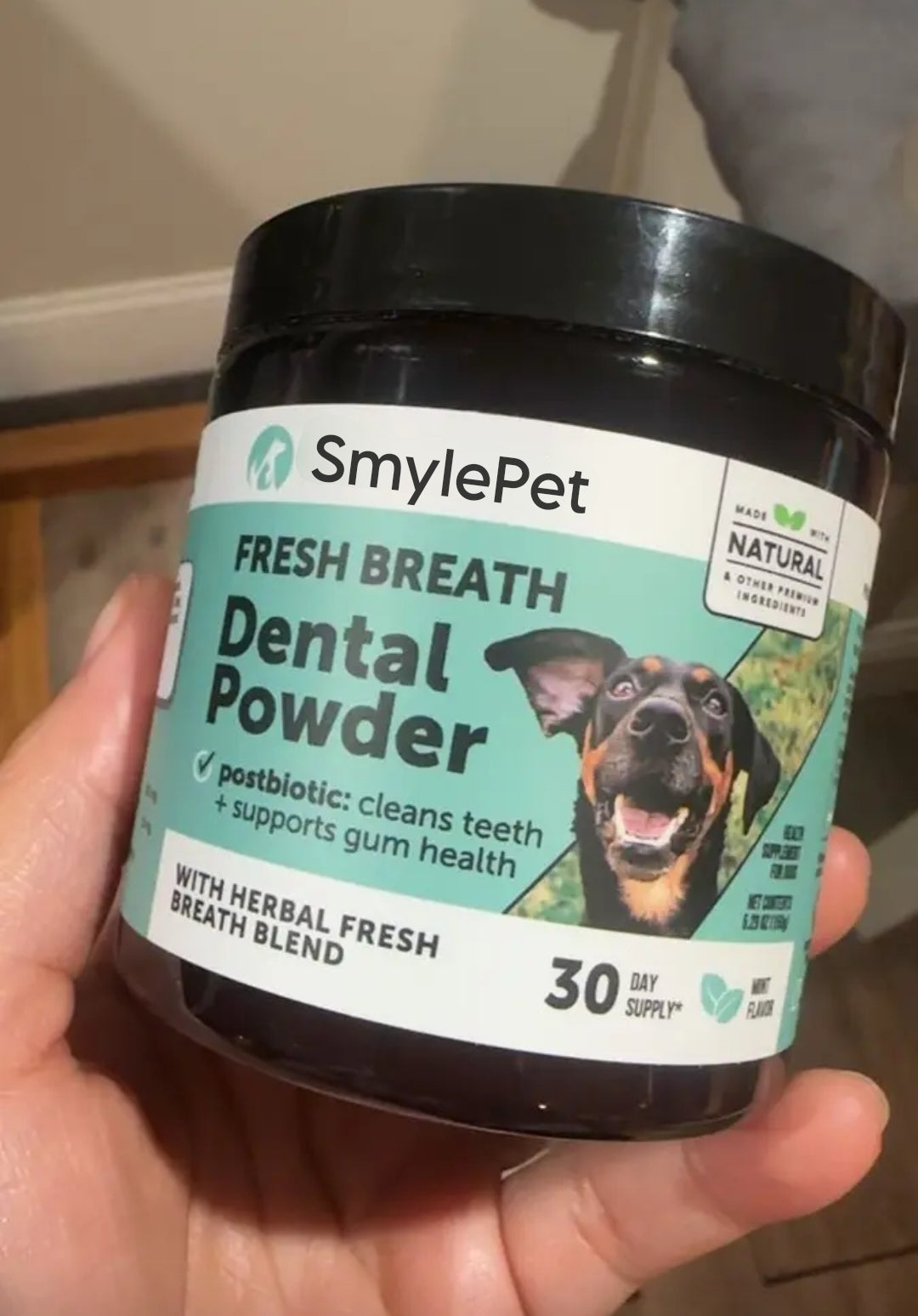 SmylePet is a daily dental health powder for dogs that you simply sprinkle over their food to support healthier teeth and gums - no brushing required. It’s formulated to help reduce plaque and tartar buildup, freshen breath, and support gum health by targeting odor-causing bacteria at the source. Poor oral hygiene in dogs can lead to gum inflammation, gingivitis, painful infections, tooth loss, difficulty eating, and even more serious health complications if left unaddressed. SmylePet works from the inside out by supporting your dog’s oral microbiome and promoting a healthier mouth environment. It’s ideal for dogs over 2 years old, dogs with visible buildup or bad breath, and pet parents looking for an easy preventative routine. With consistent use, SmylePet helps protect your dog’s long-term dental health and keeps you ahead of costly and stressful vet procedures in the future.